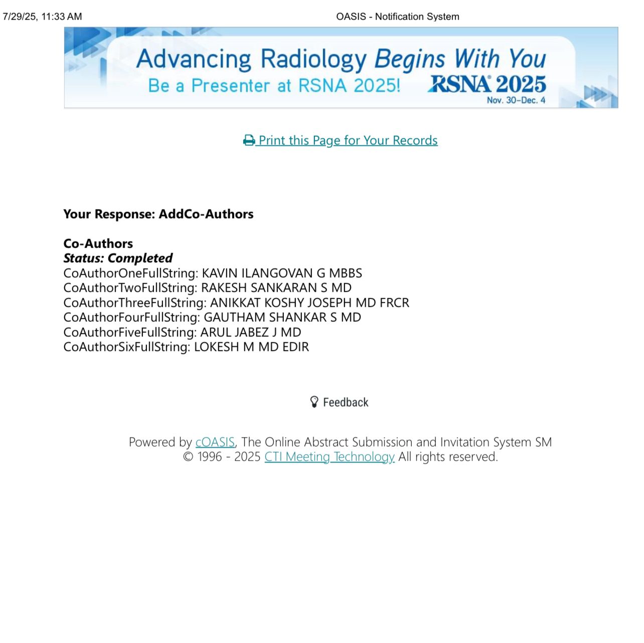 Our scientific presentation, “Imaging-Based Classification and Characterization of Spinal Dysraphism: Insights from a Tertiary Care Experience,” was successfully displayed at the Radiological Society of North America (RSNA) meeting held in Chicago 2025